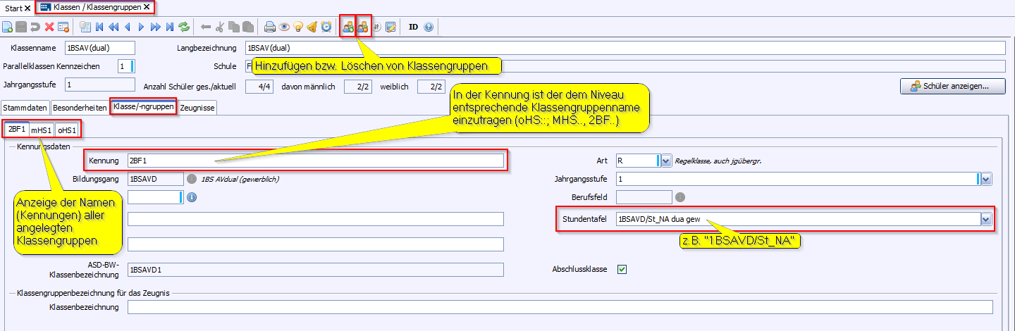 Für ASV werden die Schüler eines Niveaus in Klassengruppen zusammengefasst. Die ersten drei Buchstaben des Klassengruppennamens (Kennung) müssen den folgenden Kürzeln entsprechen: oHS, mHS, 2BF. Die nachfolgenden Zeichen können frei vergeben werden (also z.B. als Klassengruppenname oHS1).