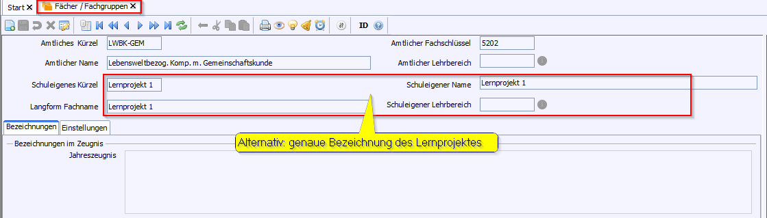 >Die Lernprojekte sind unterhalb des Fachs Lebensweltbezogene Kompetenz einzutragen.