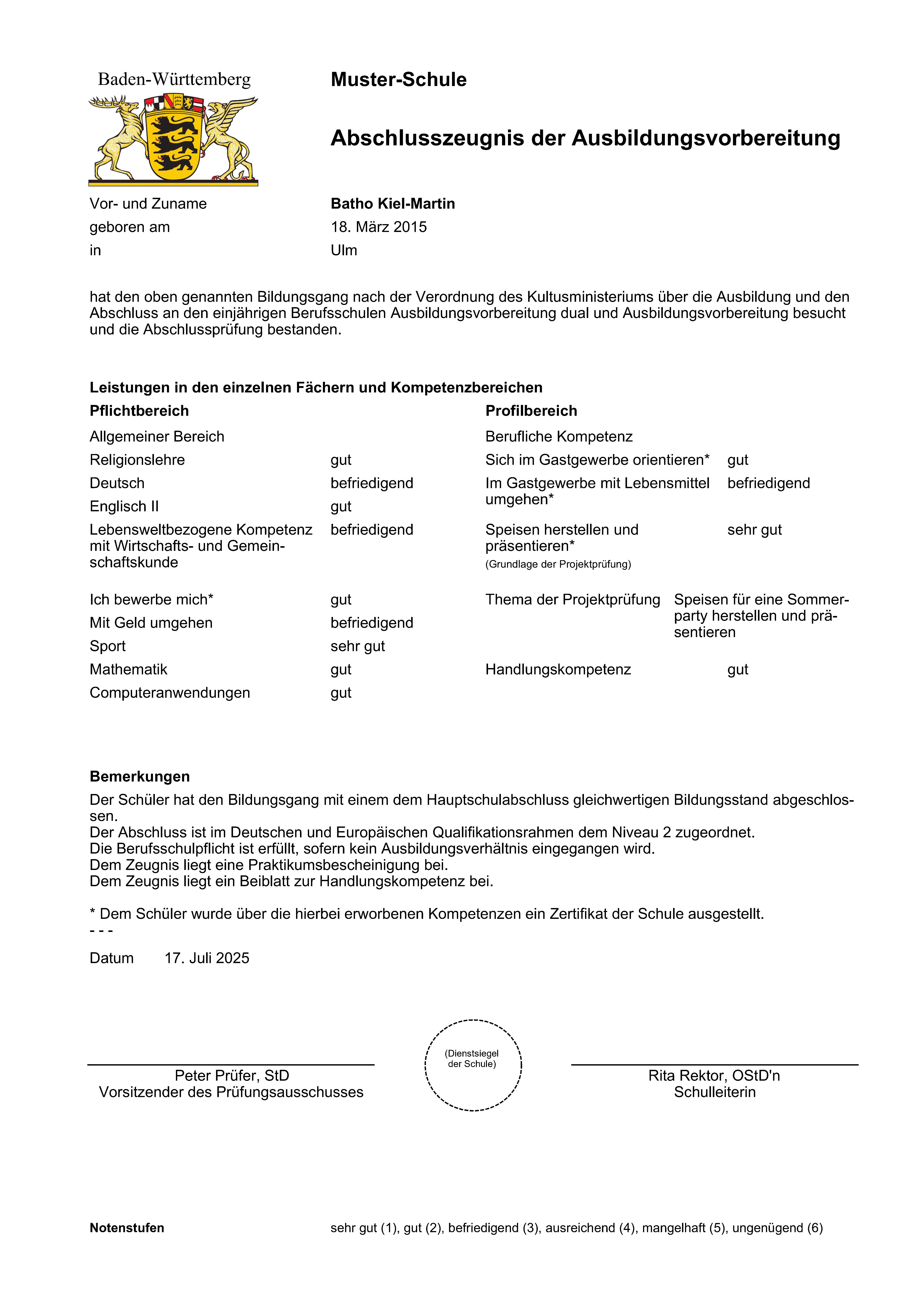 Der Leistungsstand entspricht dem Lernniveau A (DQR2).
