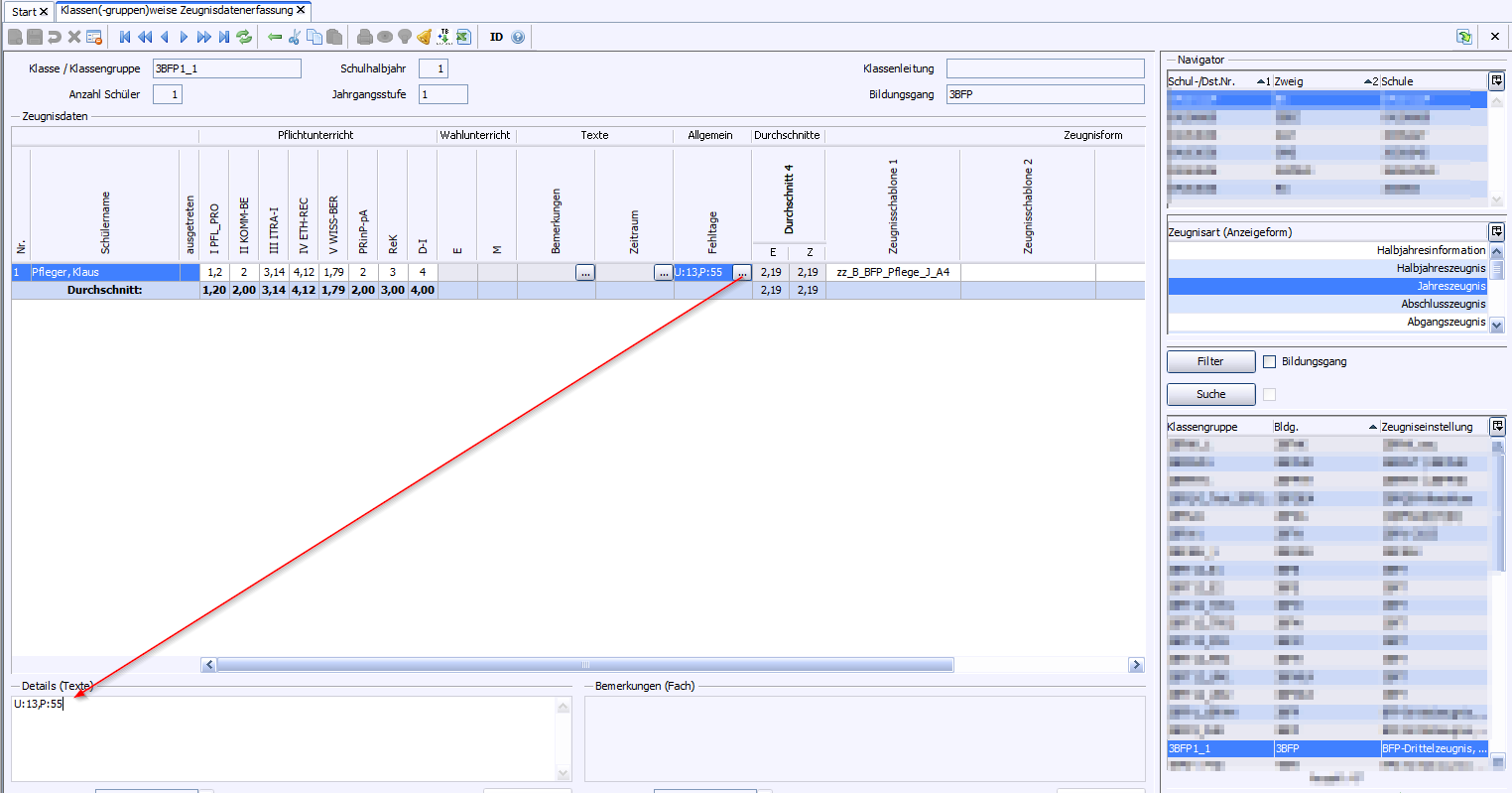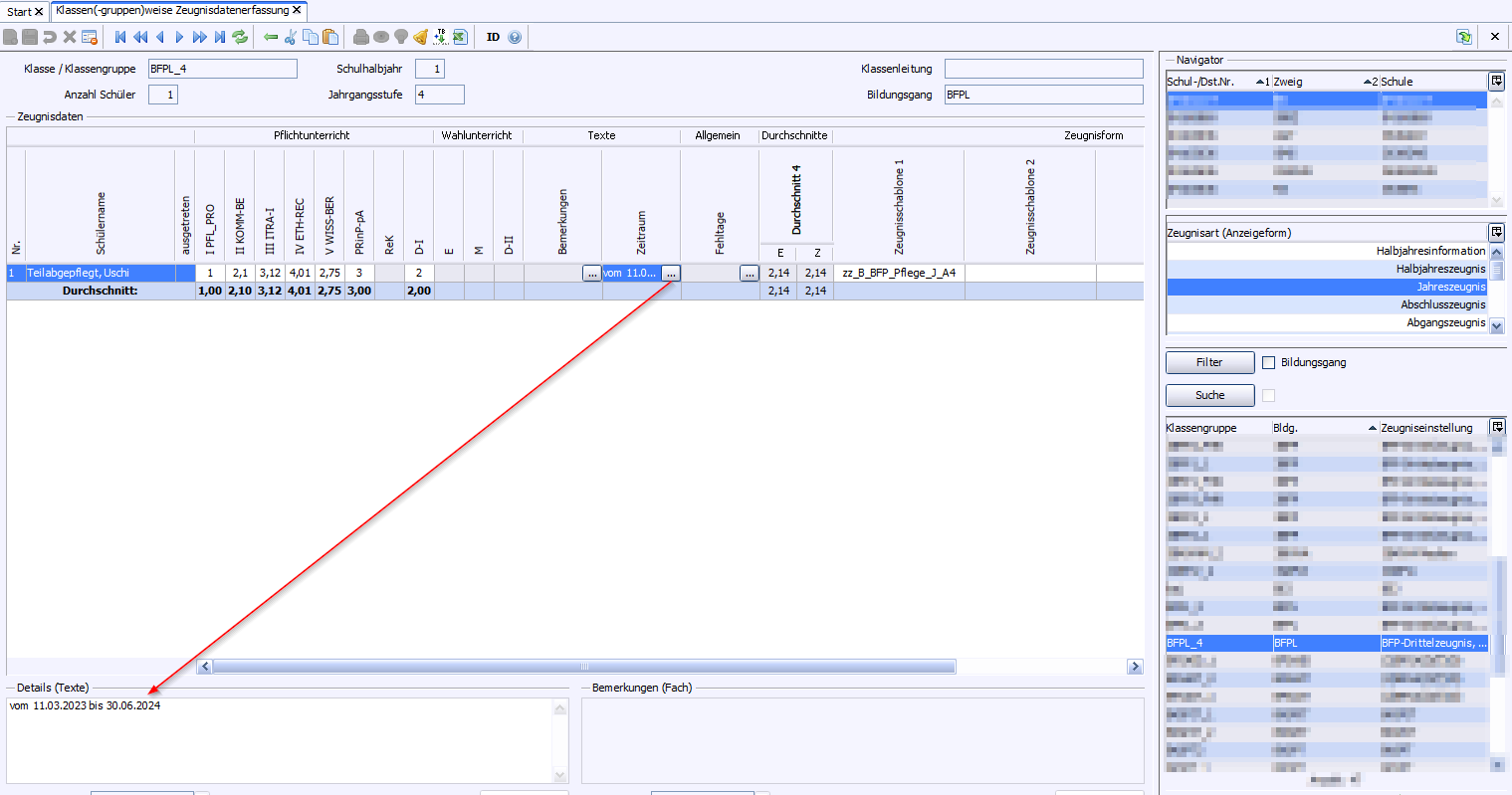 >Hier sind unter der Zusatzleistung Fehltage auch die Fehlzeiten für Unterricht und Praktikum, allerdings in der Größenordnung von Stunden einzutragen. Hierbei ist die Form U:Zahl,P:Zahl zu nutzen. •Es ist technisch derzeit nicht möglich, in der Spalte Durchschnitt 4 den Durchschnitt laut Verordnung anzuzeigen. Die Gesamtdurchschnitte werden erst in der Zeugnisschablone errechnet und können nicht in die ASV-BW Daten geschrieben werden. >Eingabe des Zeitraums (nur für den Bildungsgang BFPL). Für die Teilzeitform BFPL ist zusätzlich der Zeitraum als Texteingabe in der Form vom TT.MM.JJJJ bis TT.MM.JJJJ anzugeben. |