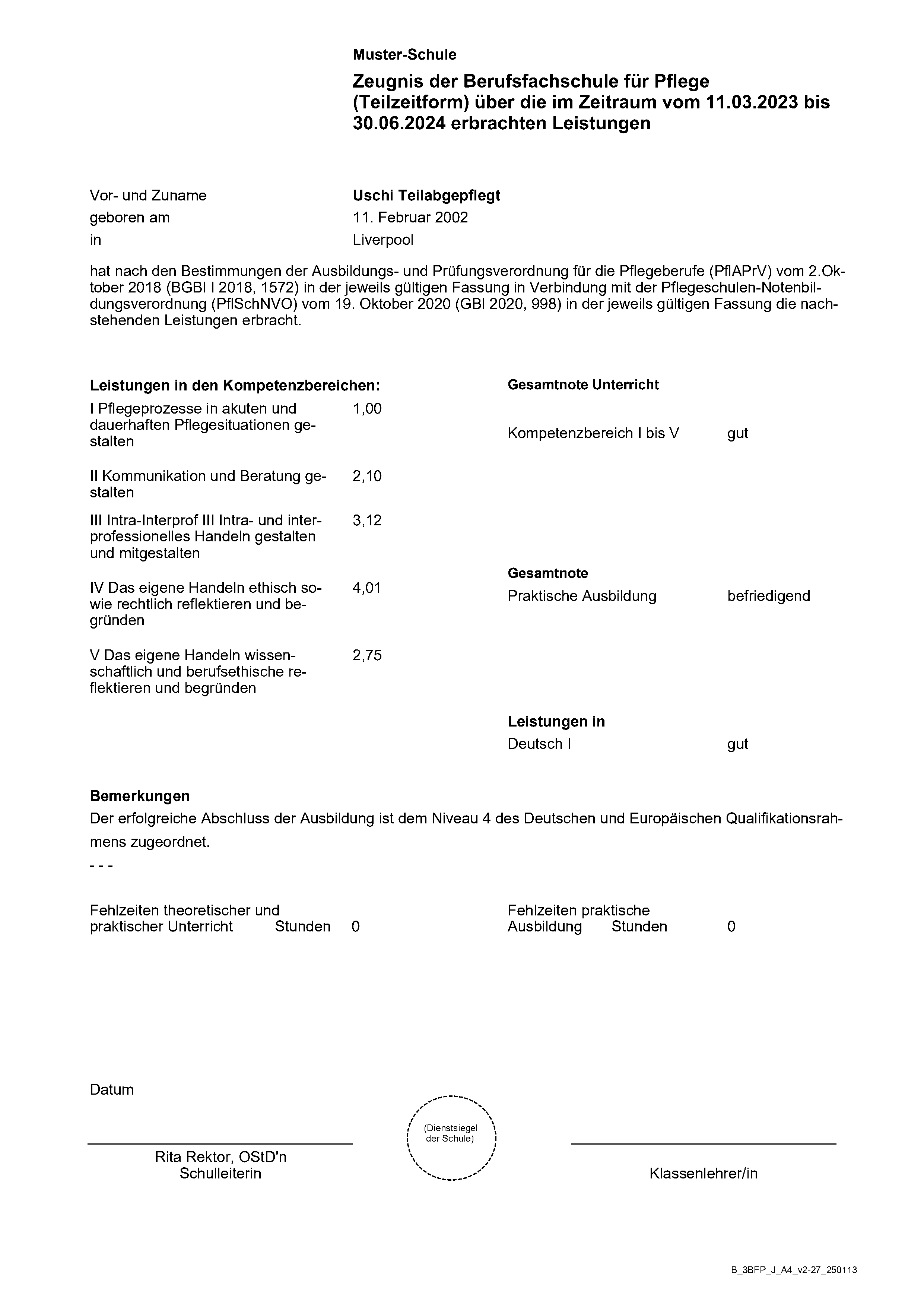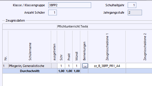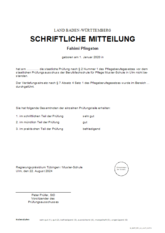 >Wählen Sie für das Zeugnis der Staatlichen Prüfung zz_B_BFP_A_A4_A_PR1. >Tragen Sie die Noten der schriftlichen, mündlichen und praktischen Prüfung ein. Die Gesamtnote wird anhand von Durchschnitt 3 errechnet. >Ausbildungsberuf: Standardmäßig wird als Ausbildungsberuf Pflegefachfrau / Pflegefachmann ausgegeben. Andere Ausbildungsberufe können über diese Kategorie erfasst werden: