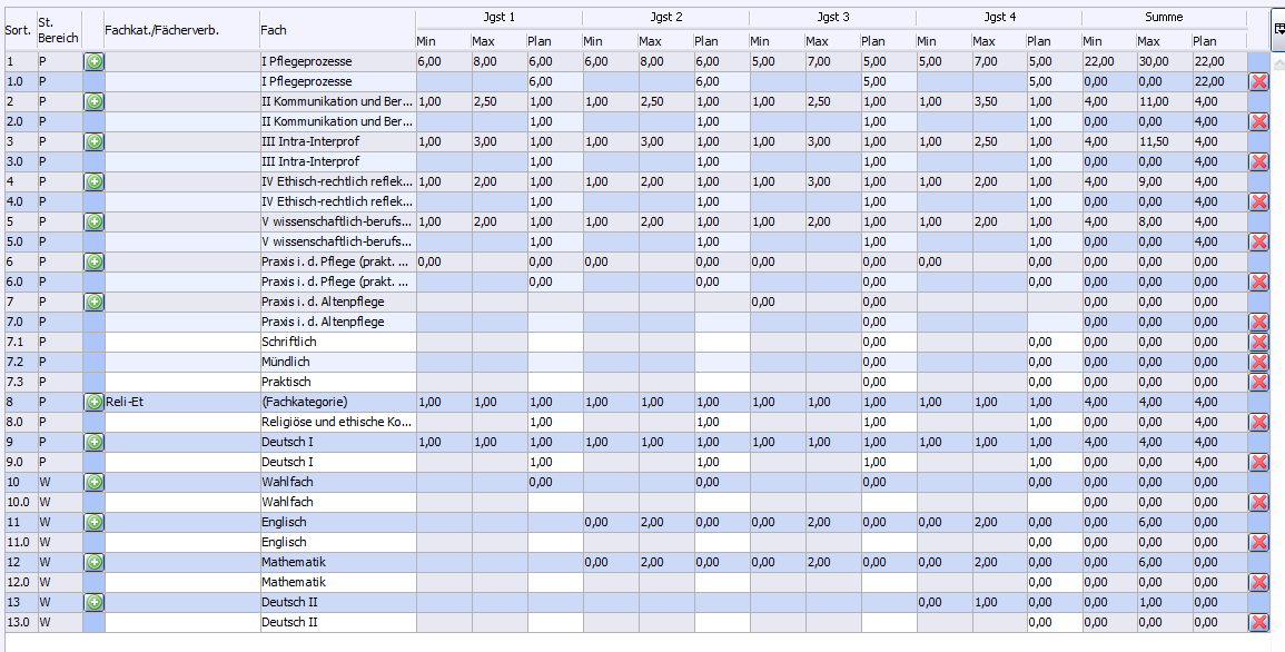 •Bildungsgänge: 3BFP, Jahrgangstufe 3; BFPL, Jahrgangstufe 4 •Modulbezogene Funktion: Fächer aus Stundentafel übernehmen: Die Fächer können sowohl aus der Stundentafel zu 3BFP als auch zu BFPL übernommen werden. •Entfernen Sie alle Fächer außer den Prüfungsteilen Schriftlich, Mündlich und Praktisch. • Fügen Sie die die Zusatzkategorien Durchschnitt 3, bestanden, Ausbildungsberuf, Bereich, Wirkdatum, Abgangsdatum und Bemerkungen hinzu. |