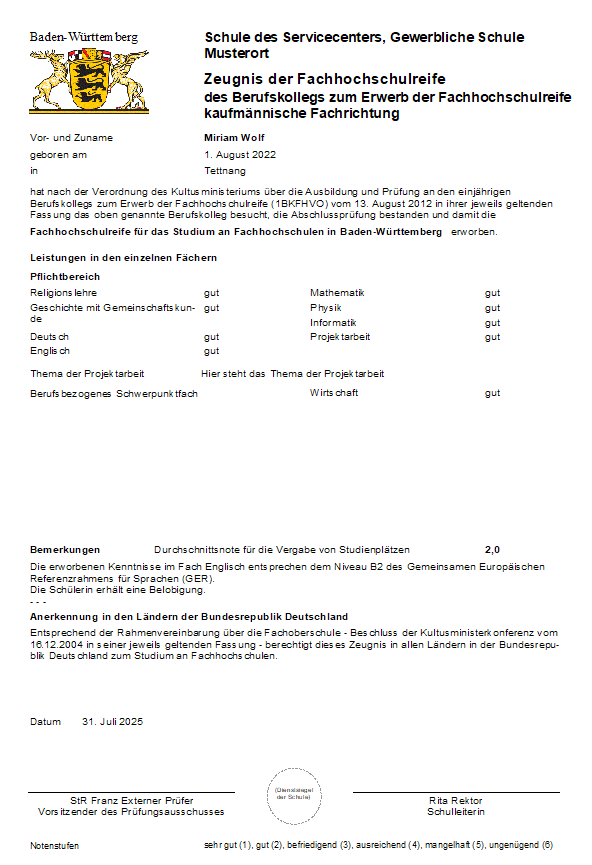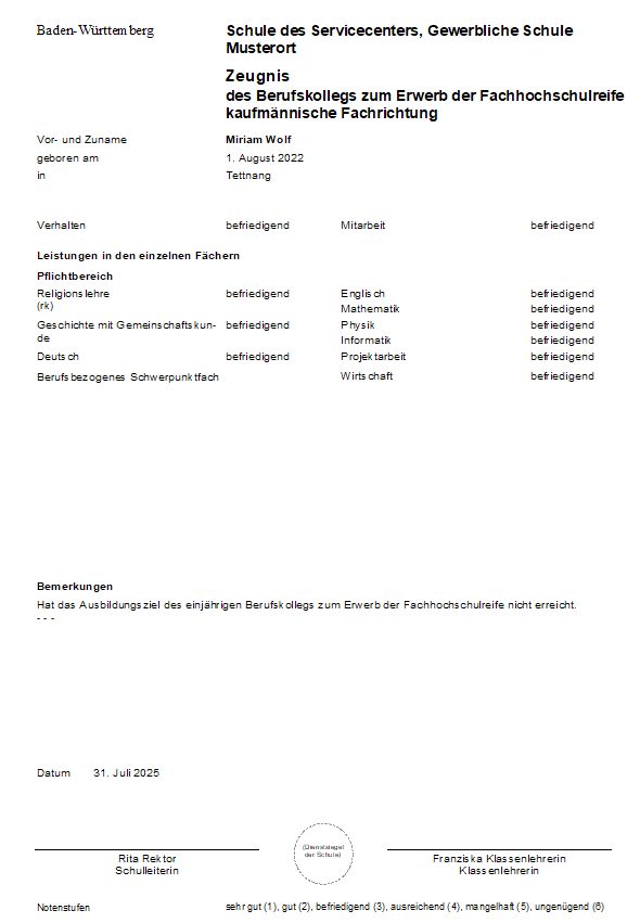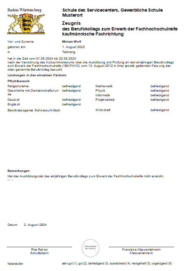 >Je nach Bildungsgang: Fachbezeichnung Wirtschaft(kaufm., im Beispiel unten) / Technische Physik (gew.) / Biologie mit Gesundheitslehre (hausw.) / Gestaltung (gestalterische Richtung) in der Spalte Art die Bezeichnung Schwerpunktauswählen.