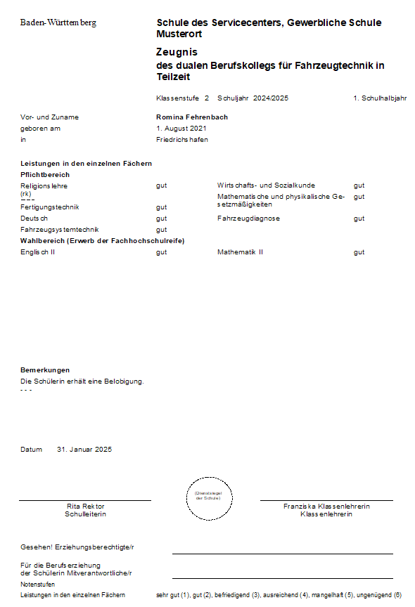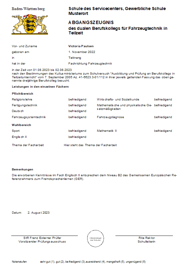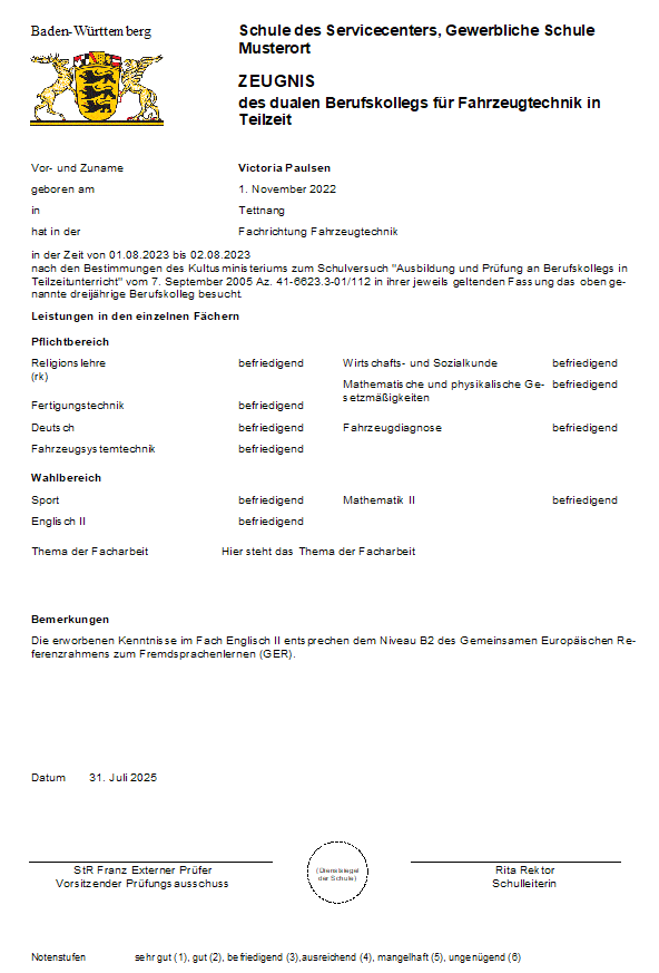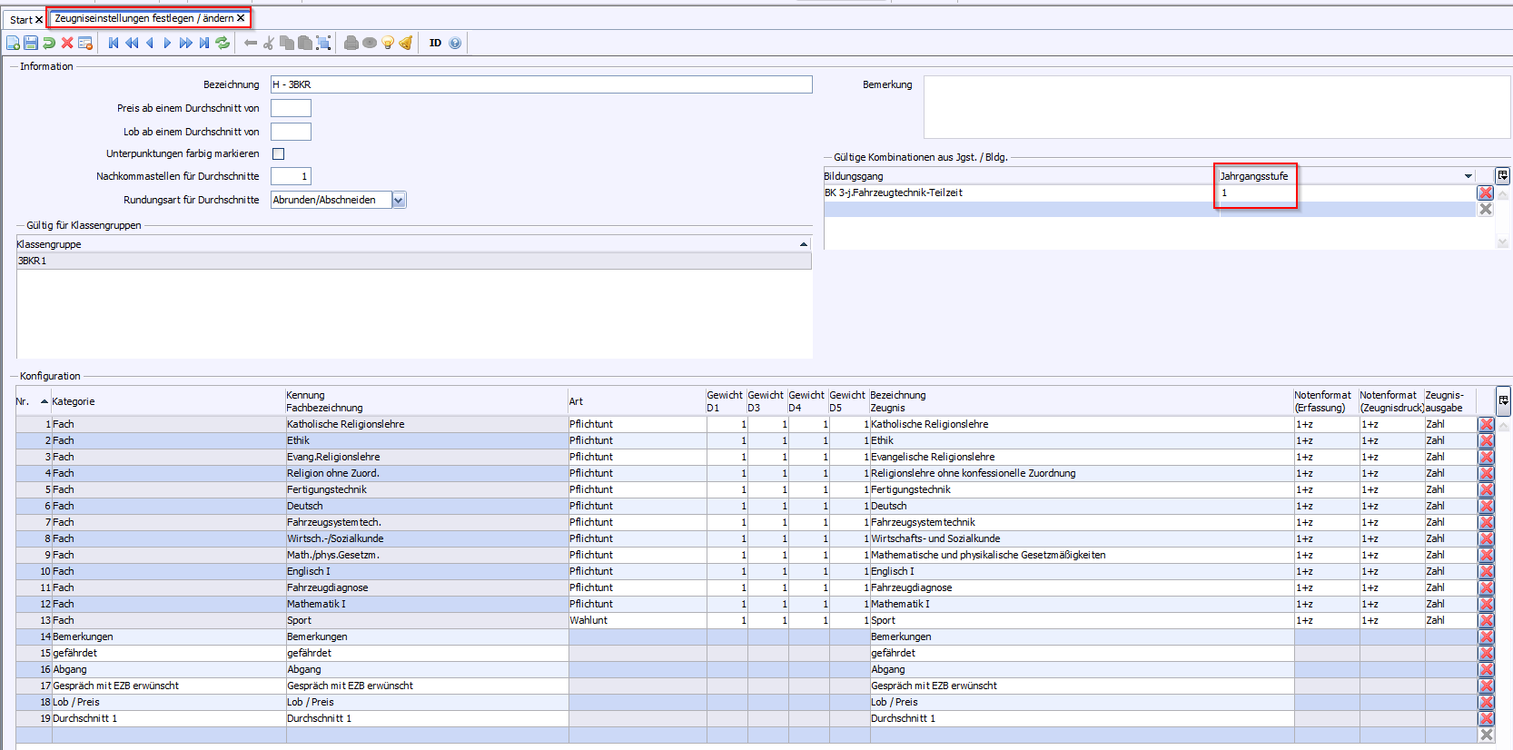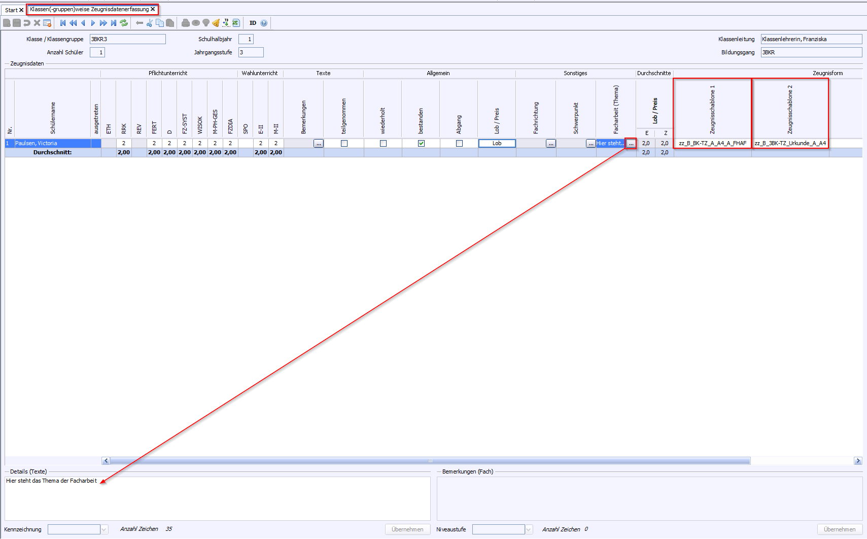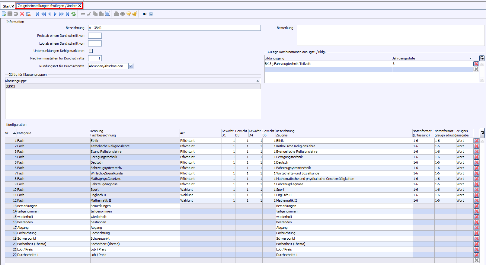 p Die unterschiedlichen Texte auf den Zeugnissen werden gemäß der in den Klassen zugewiesenen Stundentafeln erstellt. Siehe Voraussetzungen. Für die Erfassung von Einzelnoten bei zwei Abschlüssen (Assistent und Fachhochschulreife) können Sie die von uns bereitgestellten Notenblöcke verwenden. (Einstellungen Notenverwaltung) |