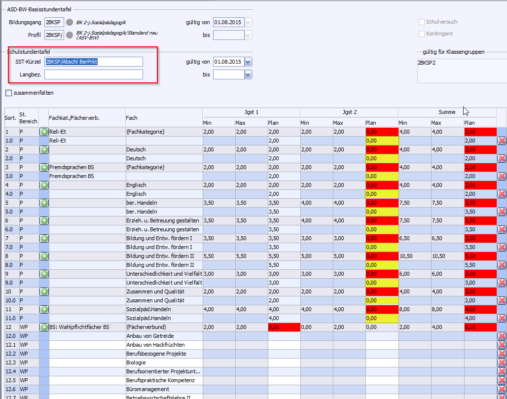 Für das Abschlusszeugnis ist eine Kopie der Schulstundentafel, die den ASA-Zeugnissen zugrunde liegt, anzulegen mit aussagekräftigem Namen, z. B. SST-Kürzel 2BKSP/Abschl BerPrkt. In dieser Schulstundentafel wird für alle Fächer, deren Noten aus dem Vorjahr übernommen werden sollen, die Stundenzahl auf 0,00 Stunden gesetzt.
