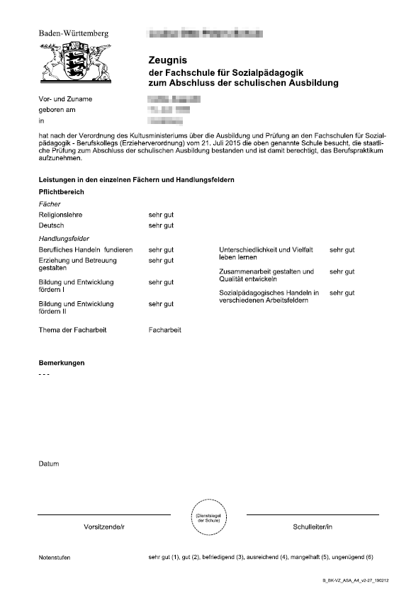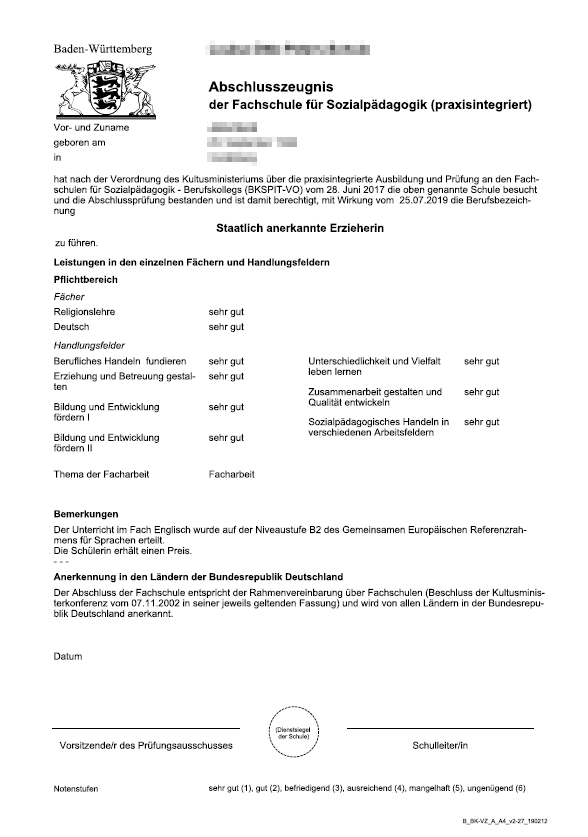 Die Schülerinnen und Schüler, die den Abschluss der schulischen Ausbildung über eine Schulfremdenprüfung absolviert haben, müssen eine erziehungspraktische Prüfung ablegen. Die Note hierfür entspricht der Leistung des Handlungsfeldes "Sozialpädagogisches Handeln" und wird dort erfasst.