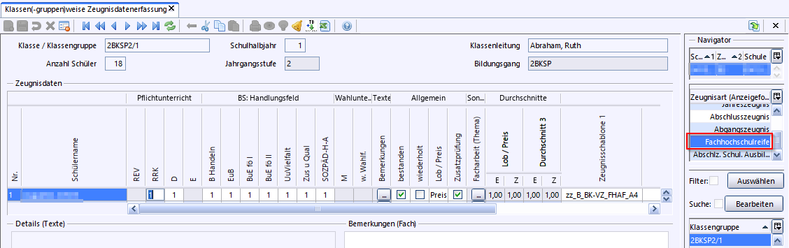 Im aktuellen Schuljahr ist in der klassengruppenweisen Zeugnisdatenerfassung zumindest die Note für die Gesamtnote des Berufspraktikums oder die Note des Kolloquiums (wenn vom Praktikum befreit) zu erfassen. Werden keine weiteren Noten eingetragen, werden diese aus dem Vorjahr zur Zeugnisart ASA entnommen.