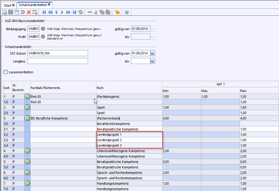 >In der Spalte Art wird die Anordnung festgelegt. Alle Fächer mit dem Standard-Eintrag Pflichtunt werden unterhalb der Pflichtfächer in der linken Spalte des Zeugnisses angezeigt. Die Fächer mit der Kategorie Berufsfachlich werden in der rechten Spalte unter einer Zwischenüberschrift Berufliche Kompetenz angeordnet. Darunter ebenfalls in der rechten Spalte erscheinen die Fächer mit der Kategorie Berufspraktisch.