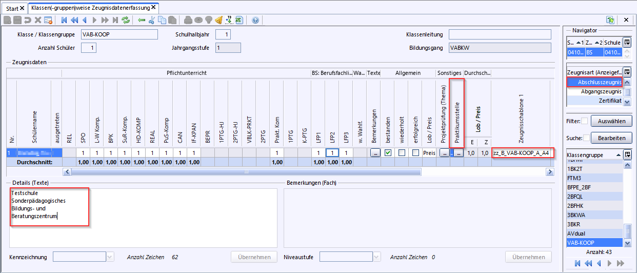 >Fügen Sie folgende Zusatzleistungen in die Zeugniskonfiguration ein: Bemerkungen, bestanden,wiederholt,erfolgreich,Lob / Preis, Durchschnitt 1,Projektprüfung (Thema), Praktikumsstelle
