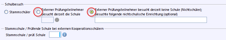 Die ASV-BW Zeugnisschablonen unterstützen die Schulfremdenprüfung. Dafür ist bei dem betreffenden Schüler in den Grunddaten eines der Felder externer Prüfungsteilnehmer entsprechend zu markieren. Dadurch ändert sich i.d.R. nicht der Zeugnistitel, sondern der Verordnungstext auf den Abschlusszeugnissen. Das Merkmal kann nur individuell eingestellt werden, nicht für eine ganze Klasse. Bei der Klassen(-gruppen)weisen Zeugnisdatenerfassung ist die Option bestanden anzuhaken. |