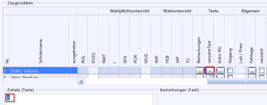 Nun kann beim Schüler bei der betreffenden Sprache in der Klasse/-ngruppenweisen Zeugnisdatenerfassung in der entsprechenden Spalte die Note eingetragen werden.