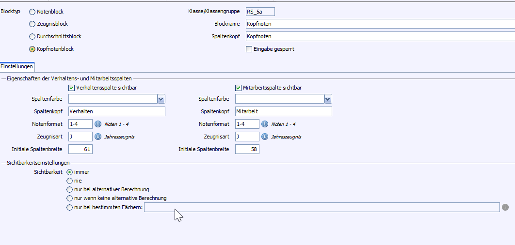 Beteiligte Notenblöcke mit Gewichtung zur Berechnung der Durchschnittsnoten z. B. für Halbjahresinformationen werden definiert.