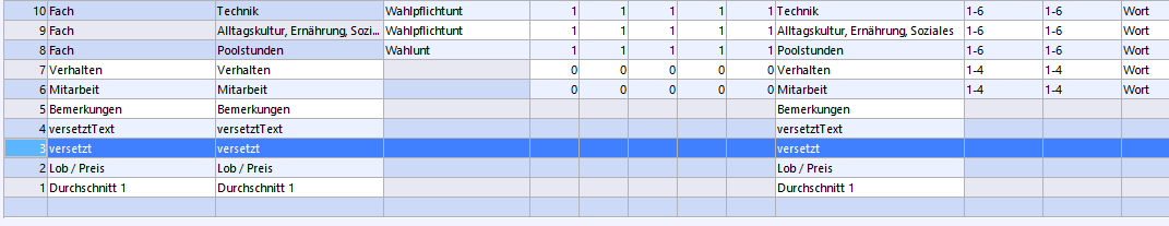 Die möglichen Werte für versetztText hängen von der Jahrgangstufe des Schülers ab: