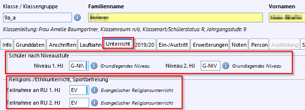 Die Zeugnisse der Realschule weisen aus, auf welcher Niveaustufe ein Schüler unterrichtet wurde. Dazu muss im Modul Schüler im Reiter Unterricht die Niveaustufe gewählt werden.