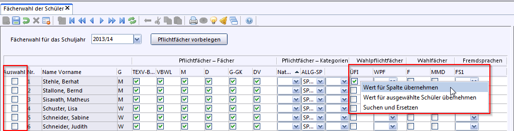Fächerwahl) können auf Grundlage der Stundentafel, die im Modul Klassen auf dem Reiter Klassengruppe hinterlegt ist, den Schülern die Fächer zugewiesen werden, die sie belegen werden.