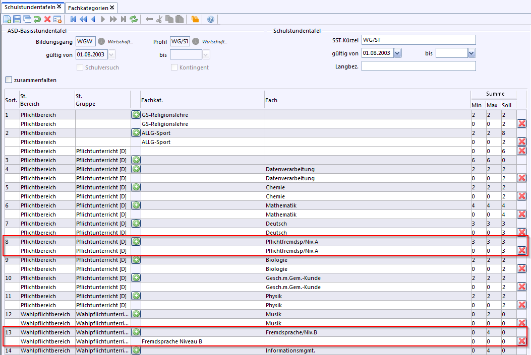 Enthält die Klassenstundentafel im Pflichtbereich eine Fachkategorie Fremdsprache, die mit FS beginnt, wird diese in der angezeigten Tabelle unter der Überschrift Fremdsprachen und nicht im Bereich Pflichtfächer abgebildet. Die Belegung wird mit der Fremdsprachenfolge auf der Schülerpersonalkarte (Reiter Laufbahn) synchronisiert. |